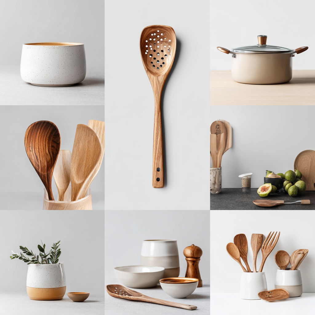 Les ustensiles en bois offrent une prise en main agréable et sont parfaits pour cuisiner sans abîmer vos casseroles, tandis que les bols et récipients en céramique présentent une finition douce et minimaliste qui s’intègre harmonieusement dans n’importe quel intérieur moderne.